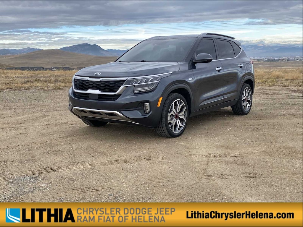 Lithia Chrysler Dodge Jeep RAM FIAT of Helena is pleased to offer this Gravity Gray 2021 Kia Seltos SX for purchase, this vehicle is well equipped with many features including: SX Sunroof Package (Sunroof), Navigation System, 18 Alloy Wheels, 4-Wheel Disc Brakes, 4.643 Axle Ratio, 8 Speakers, ABS brakes, Air Conditioning, Alloy wheels, AM/FM radio: SiriusXM, Apple CarPlay & Android Auto, Auto-dimming Rear-View mirror, Automatic temperature control, Brake assist, Bumpers: body-color, Cargo Mat, Carpeted Floor Mats, Delay-off headlights, Driver door bin, Driver vanity mirror, Dual front impact airbags, Dual front side impact airbags, Electronic Stability Control, Emergency communication system, Exterior Parking Camera Rear, Four wheel independent suspension, Front anti-roll bar, Front Bucket Seats, Front Center Armrest, Front fog lights, Front reading lights, Fully automatic headlights, Heated door mirrors, Heated Front Bucket Seats, Heated front seats, Illuminated entry, Leather Seat Trim, Leather Shift Knob, Low tire pressure warning, Occupant sensing airbag, Outside temperature display, Overhead airbag, Overhead console, Panic alarm, Passenger door bin, Passenger vanity mirror, Power door mirrors, Power driver seat, Power steering, Power windows, Radio: AM/FM/MP3 Display Audio, Rear seat center armrest, Rear window defroster, Rear window wiper, Remote keyless entry, Security system, Smart Key w/ Push Button and Remote Start, Speed control, Speed-sensing steering, Split folding rear seat, Spoiler, Steering wheel mounted audio controls, Tachometer, Telescoping steering wheel, Tilt steering wheel, Traction control, Trip computer, Turn signal indicator mirrors, and Variably intermittent wipers. Clean CARFAX. Gravity Gray 2021 Kia Seltos SX SX AWD 7-Speed Automatic I4