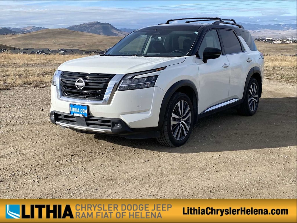 Lithia Chrysler Dodge Jeep RAM FIAT of Helena is pleased to offer this Pearl White Tricoat/Super Black 2022 Nissan Pathfinder Platinum for purchase, this vehicle is well equipped with many features including: Cargo Package (Cargo Area Protector, Cargo Net, and First Aid Kit), 4WD, 13 Speakers, 3rd row seats: bench, 4-Wheel Disc Brakes, ABS brakes, Air Conditioning, Alloy wheels, AM/FM radio: SiriusXM, Auto High-beam Headlights, Auto tilt-away steering wheel, Auto-dimming Rear-View mirror, Automatic temperature control, Axle Ratio: TBD, Black Splash Guards (Set of 4), Bodyside moldings, Bose Premium Audio System, Brake assist, Bumpers: body-color, Captains Chairs Carpeted Floor Mats (Set of 4), Climate Controlled Front Bucket Seats, Cross Bars, Delay-off headlights, Driver door bin, Driver vanity mirror, Dual front impact airbags, Dual front side impact airbags, Electronic Stability Control, Emergency communication system: NissanConnect Services, Exterior Parking Camera Rear, Four wheel independent suspension, Front anti-roll bar, Front Bucket Seats, Front Center Armrest, Front dual zone A/C, Front fog lights, Front reading lights, Fully automatic headlights, Garage door transmitter: HomeLink, Heads-Up Display, Heated door mirrors, Heated front seats, Heated rear seats, Heated steering wheel, Illuminated entry, Knee airbag, Leather steering wheel, Low tire pressure warning, Memory seat, Navigation system: NissanConnect Navigation, NissanConnect w/Navigation & Services, Occupant sensing airbag, Outside temperature display, Overhead airbag, Overhead console, Panic alarm, Passenger door bin, Passenger vanity mirror, Power door mirrors, Power driver seat, Power Liftgate, Power moonroof, Power passenger seat, Power steering, Power windows, Radio data system, Radio: AM/FM Audio System, Rain sensing wipers, Rear air conditioning, Rear anti-roll bar, Rear reading lights, Rear side impact airbag, Rear window defroster, Rear window wiper, Reclining 3rd row seat, Remote keyless entry, Security system, Semi-Aniline Leather Seating Surfaces, Speed control, Speed-sensing steering, Speed-Sensitive Wipers, Split folding rear seat, Spoiler, Steering wheel memory, Steering wheel mounted audio controls, Tachometer, Telescoping steering wheel, Tilt steering wheel, Traction control, Trip computer, Turn signal indicator mirrors, Variably intermittent wipers, Ventilated front seats, and Wheels: 20 Alloy w/Unique Finish. Recent Arrival! CARFAX One-Owner. Clean CARFAX. Pearl White Tricoat/Super Black 2022 Nissan Pathfinder Platinum Platinum 4WD 9-Speed Automatic V6