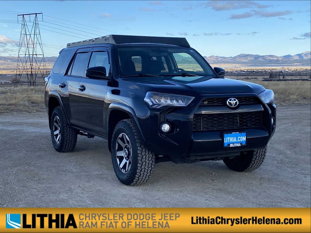 Lithia Chrysler Dodge Jeep RAM FIAT of Helena is pleased to offer this Midnight Black Metallic 2019 Toyota 4Runner SR5 for purchase, this vehicle is well equipped with many features including: 4WD, Black Graphite w/Fabric Seat Trim, Exterior Parking Camera Rear, Power driver seat, Radio: Entune Audio Plus, 17 x 7.0 6-Spoke Alloy Wheels, 3.727 Axle Ratio, 4-Wheel Disc Brakes, 8 Speakers, ABS brakes, Air Conditioning, Alloy wheels, AM/FM radio: SiriusXM, Anti-whiplash front head restraints, Brake assist, Bumpers: body-color, CD player, Driver door bin, Driver vanity mirror, Dual front impact airbags, Dual front side impact airbags, Electronic Stability Control, Emergency communication system: Safety Connect, Front anti-roll bar, Front Bucket Seats, Front Center Armrest, Front fog lights, Front reading lights, Front wheel independent suspension, Heated door mirrors, Illuminated entry, Knee airbag, Leather Shift Knob, Leather steering wheel, Low Fabric Seat Trim, Low tire pressure warning, Occupant sensing airbag, Outside temperature display, Overhead airbag, Overhead console, Panic alarm, Passenger door bin, Passenger vanity mirror, Power door mirrors, Power steering, Power windows, Rear anti-roll bar, Rear seat center armrest, Rear window defroster, Rear window wiper, Remote keyless entry, Roof rack: rails only, Security system, Speed control, Speed-sensing steering, Split folding rear seat, Spoiler, Steering wheel mounted audio controls, Tachometer, Telescoping steering wheel, Tilt steering wheel, Traction control, Trip computer, and Variably intermittent wipers. Clean CARFAX. Midnight Black Metallic 2019 Toyota 4Runner SR5 SR5 4WD 5-Speed Automatic with Overdrive 4.0L V6 SMPI DOHC